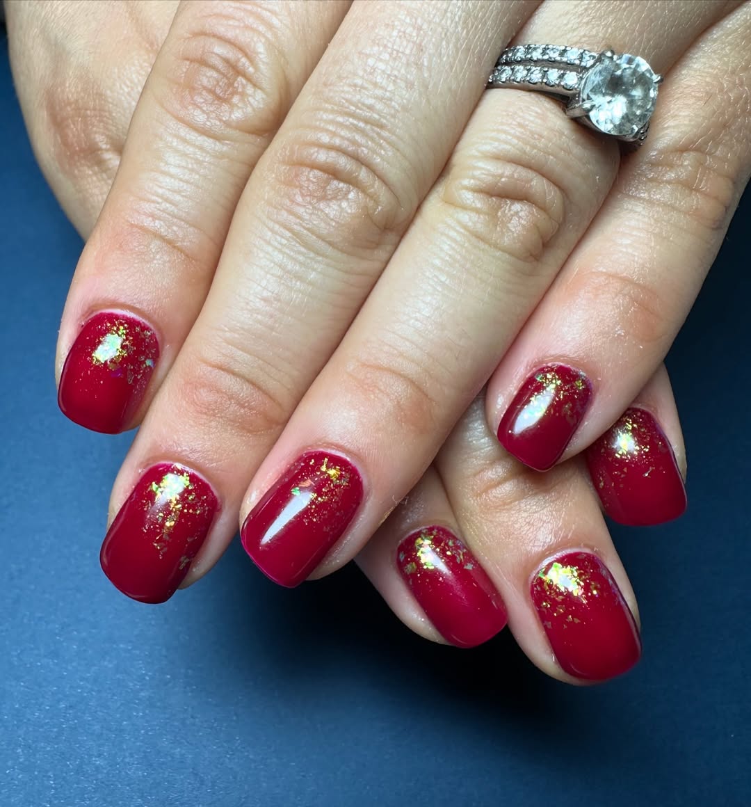 This manicure evokes the feeling of a cherished heirloom, combining a deep cranberry base with artfully scattered gold foil. The result is a quiet richness, festive yet understated, and perfect for catching the light. It’s a design that feels inherently elegant and timeless, suitable for various occasions and seasons.