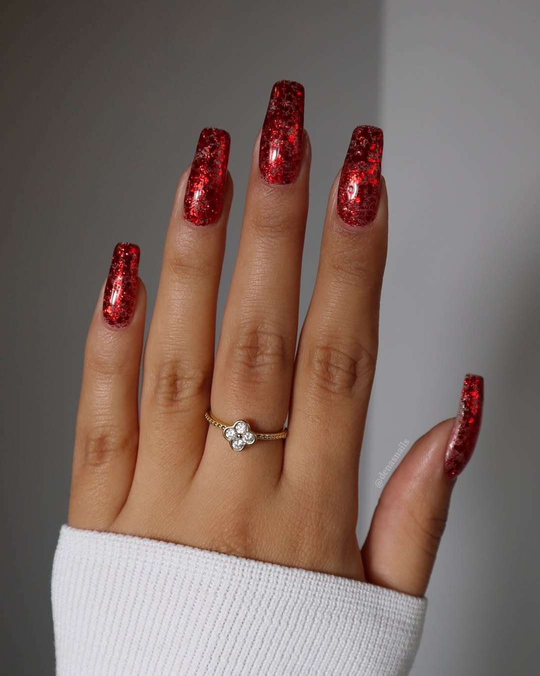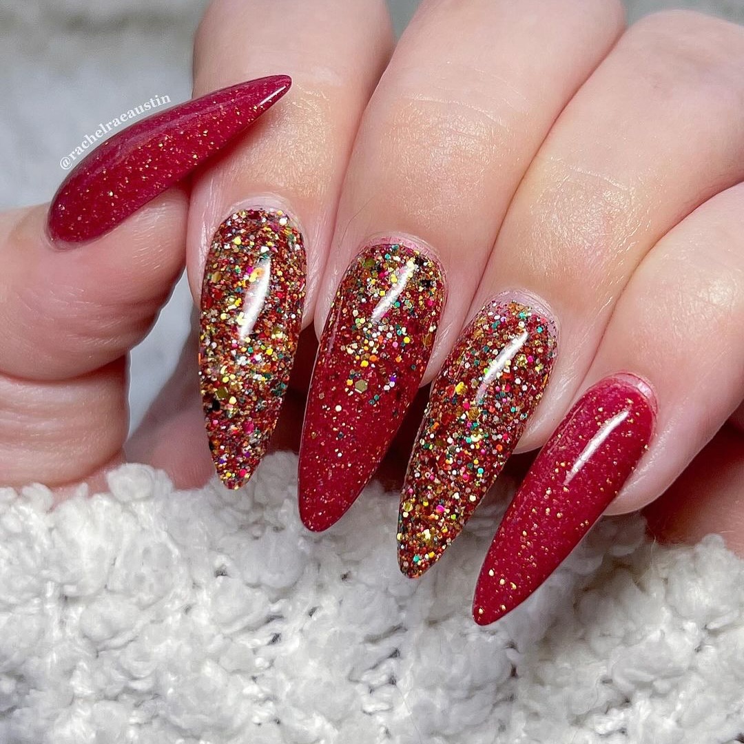 Embrace the full intensity of cranberry red with this high-shine, glitter-infused design. The bold sparkle and striking shape create a celebratory look, reminiscent of crushed garnets under bright lights. It’s a glamorous choice for when you want your nails to be a standout accessory.