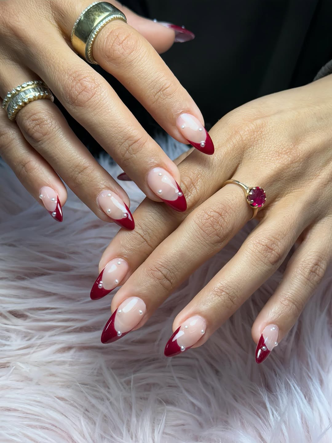 Elevate the classic cranberry French tip with the addition of delicate pearl accents. The soft nude base keeps the design balanced, allowing the striking red tips to stand out, creating a look of quiet luxury and romantic elegance.