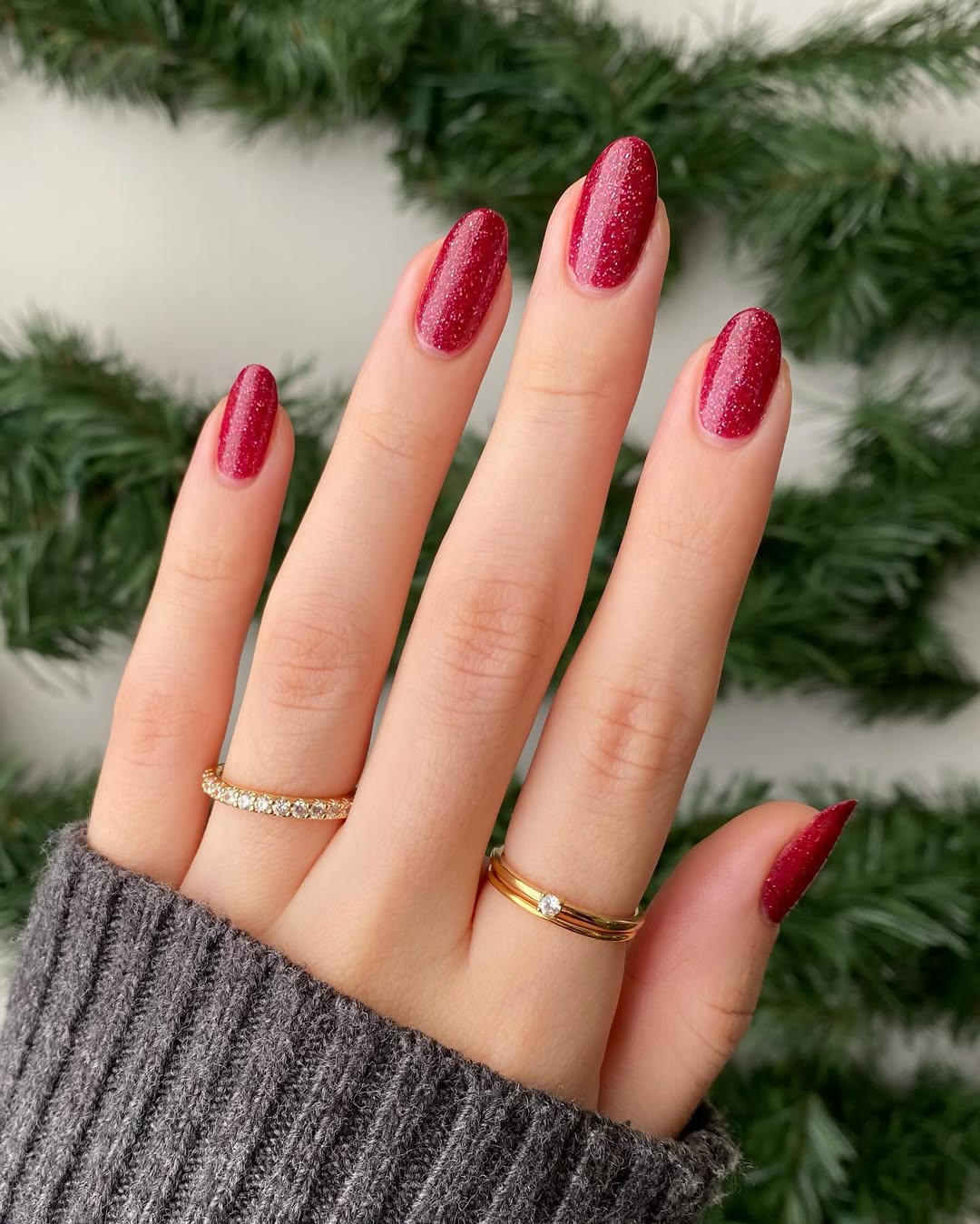 This manicure embraces warmth and comfort. The cranberry shade is rich and inviting, complemented by a fine glitter that provides a subtle, inviting glow. It’s a design suited for relaxed winter afternoons, adding a touch of quiet sparkle to everyday moments.