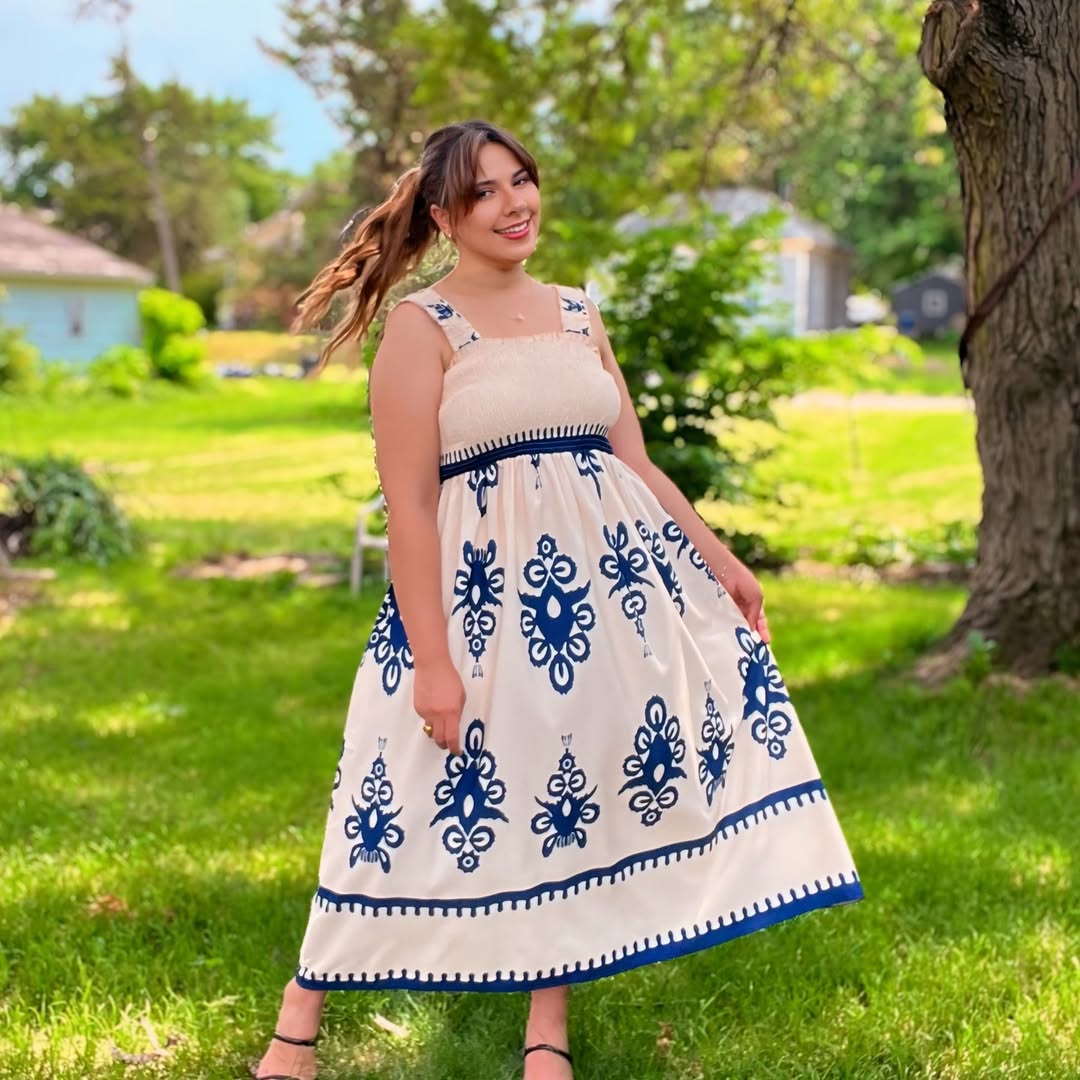 The soft cream base contrasted with deep blue detailing gives this maxi dress an artisanal, almost heirloom quality. Gathered detailing at the waist and a voluminous skirt create a flattering shape.