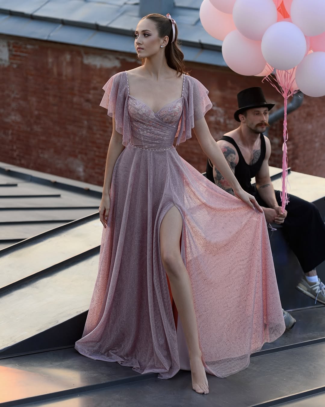 This blush-toned maxi dress, featuring subtle shimmer and a modest slit, exudes a romantic charm. The airy sleeves and flowing skirt create beautiful movement that catches the light.
