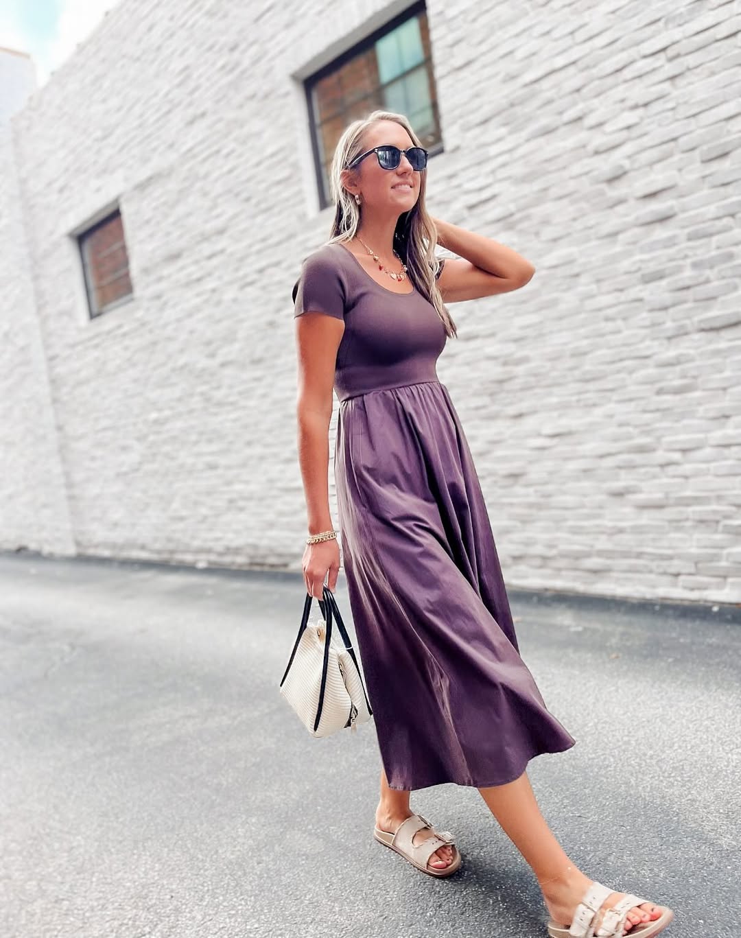 This rich plum maxi dress epitomizes understated elegance. The fitted top seamlessly transitions into a flowing skirt that gracefully moves with each step. Complemented by simple neutral slides and a woven handbag, it strikes a balance between relaxed comfort and refined style.