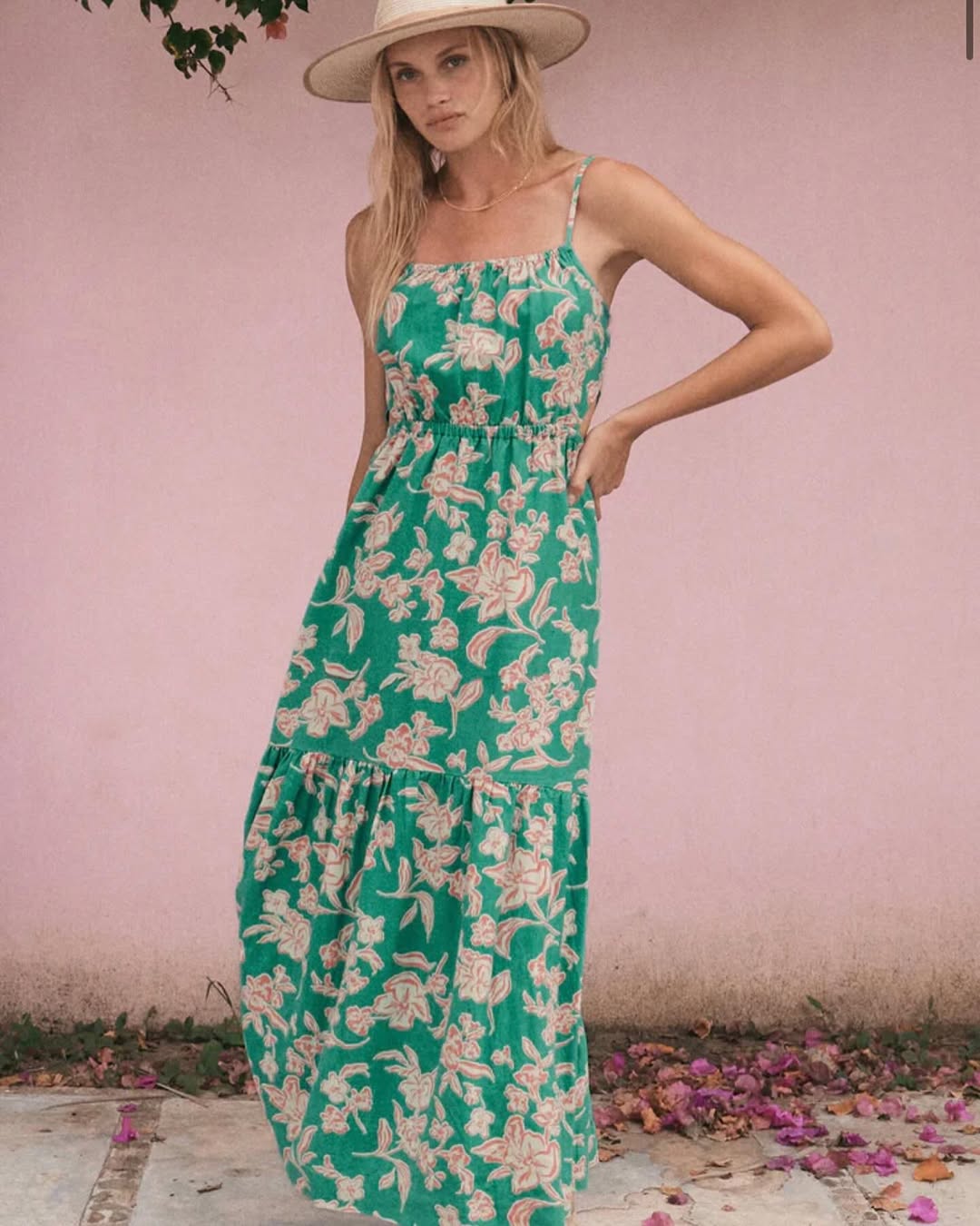 This green floral maxi dress evokes a vacation-ready feel. The slim straps, softly gathered waist, and tiered hem contribute to a breezy, sun-drenched vibe perfect for relaxed settings.