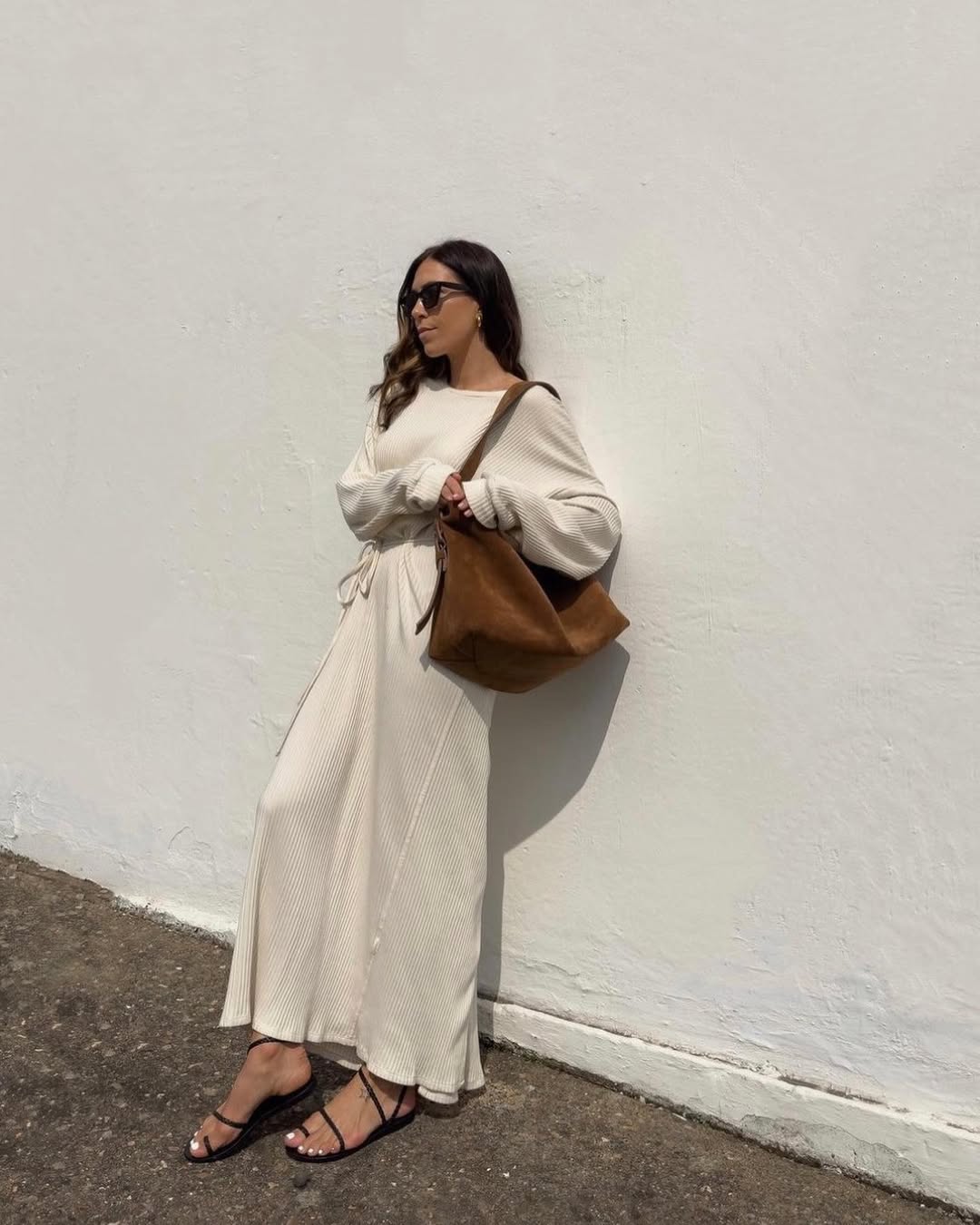 A neutral ribbed maxi dress styled against a clean white backdrop embodies understated chic. Long sleeves and a defined waist create shape, while the soft knit fabric ensures comfort.
