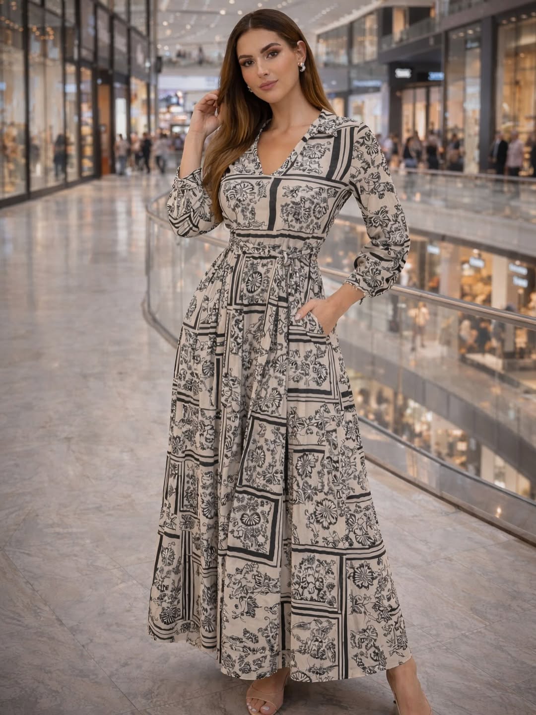This printed maxi dress injects vintage charm into everyday wear. The structured top and softly flared skirt give it a noticeable presence without appearing overly formal.