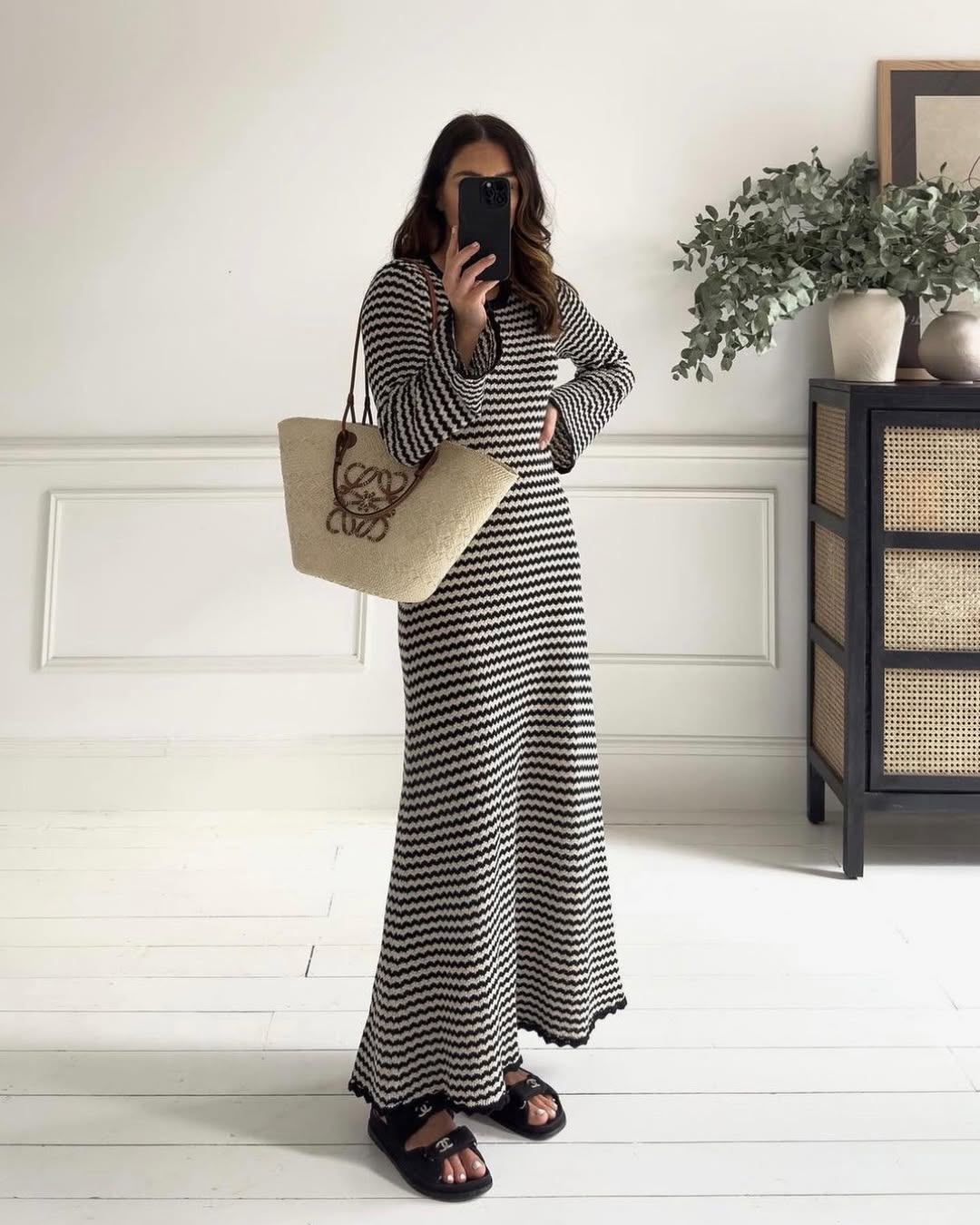 A black and white knit maxi in a relaxed silhouette offers a modern and effortless aesthetic. The subtle zigzag pattern adds visual texture without being overpowering.