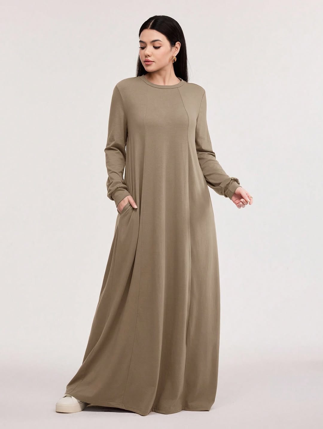 This taupe maxi dress is the epitome of understated comfort. Its long sleeves, relaxed fit, and practical pockets enhance its wearability, while clean lines maintain a refined appearance.