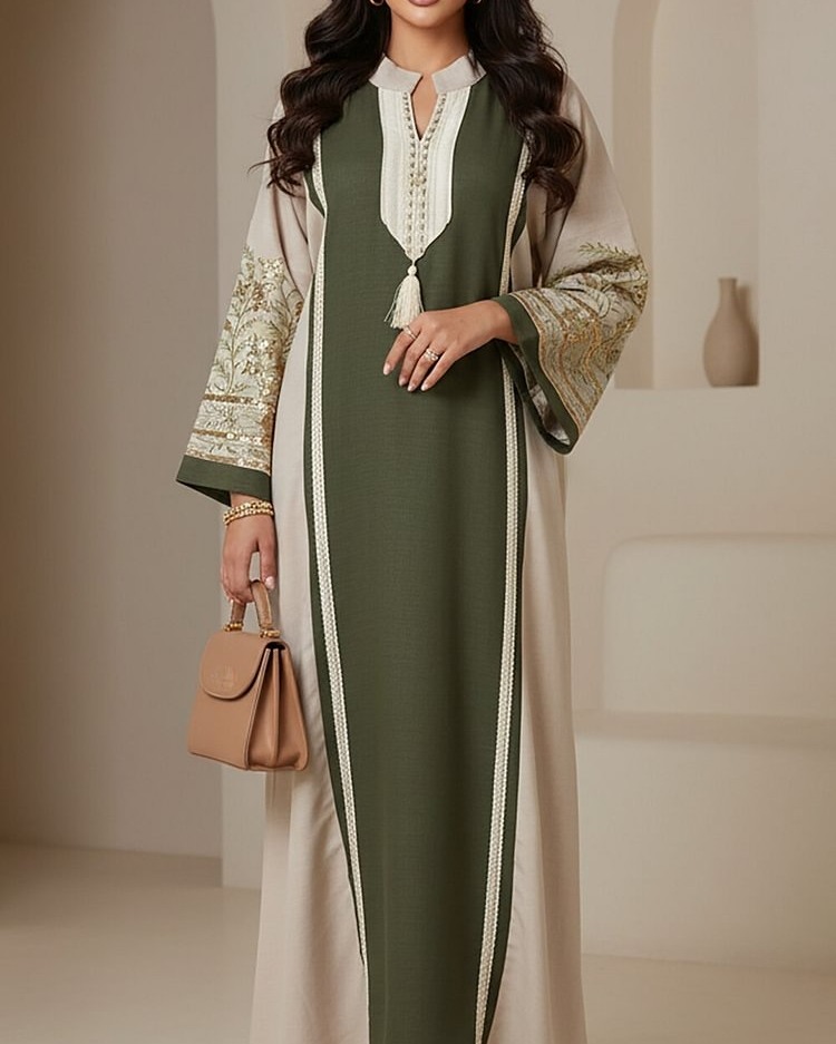 This olive and cream maxi dress harmonizes modest design with contemporary styling. Vertical patterns enhance the elongating effect of the silhouette, while the detailed sleeves add depth.