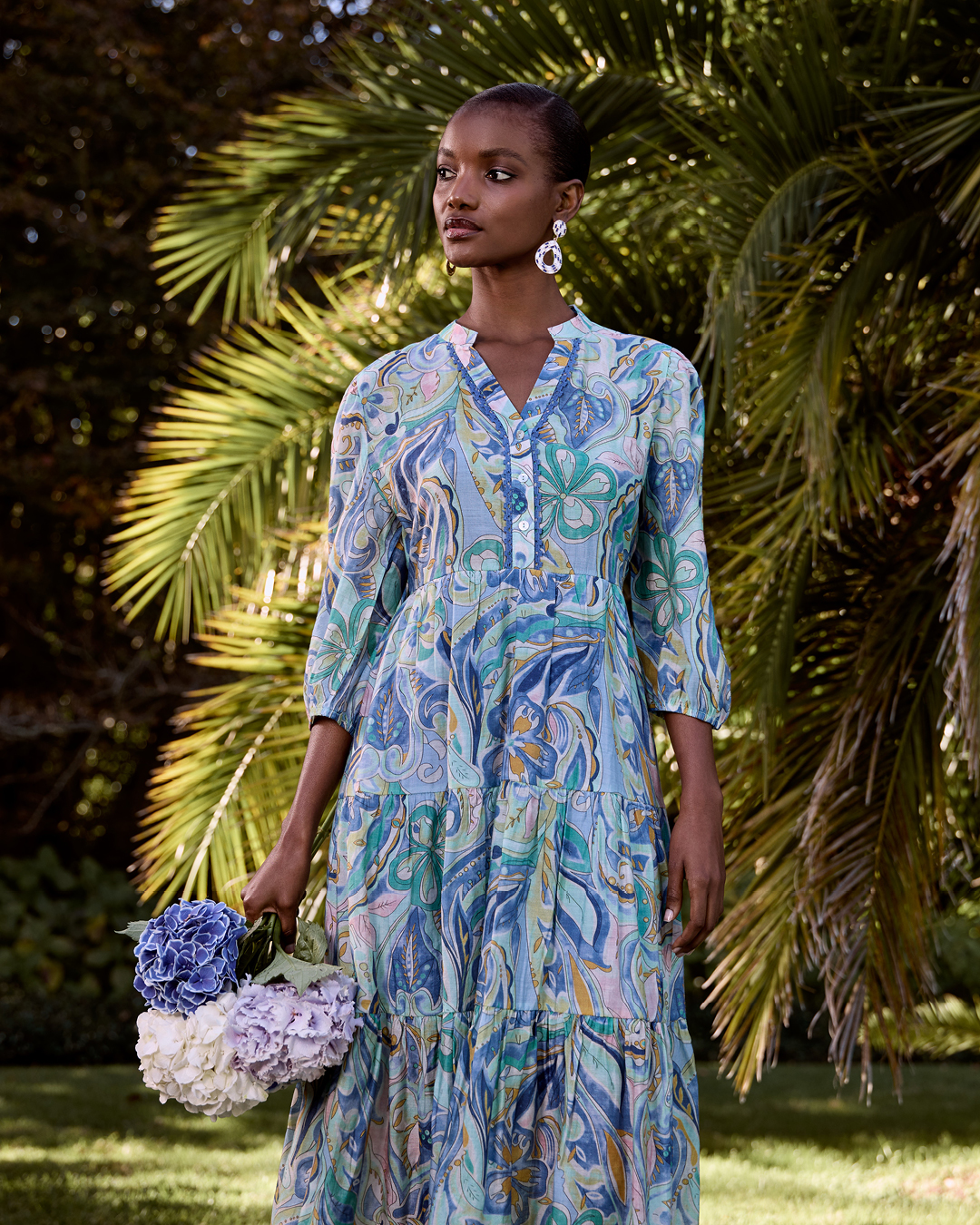 This dress is ideal for garden brunches or outdoor gatherings. Keeping accessories simple with white sandals and a soft clutch allows the vibrant print to be the focal point.