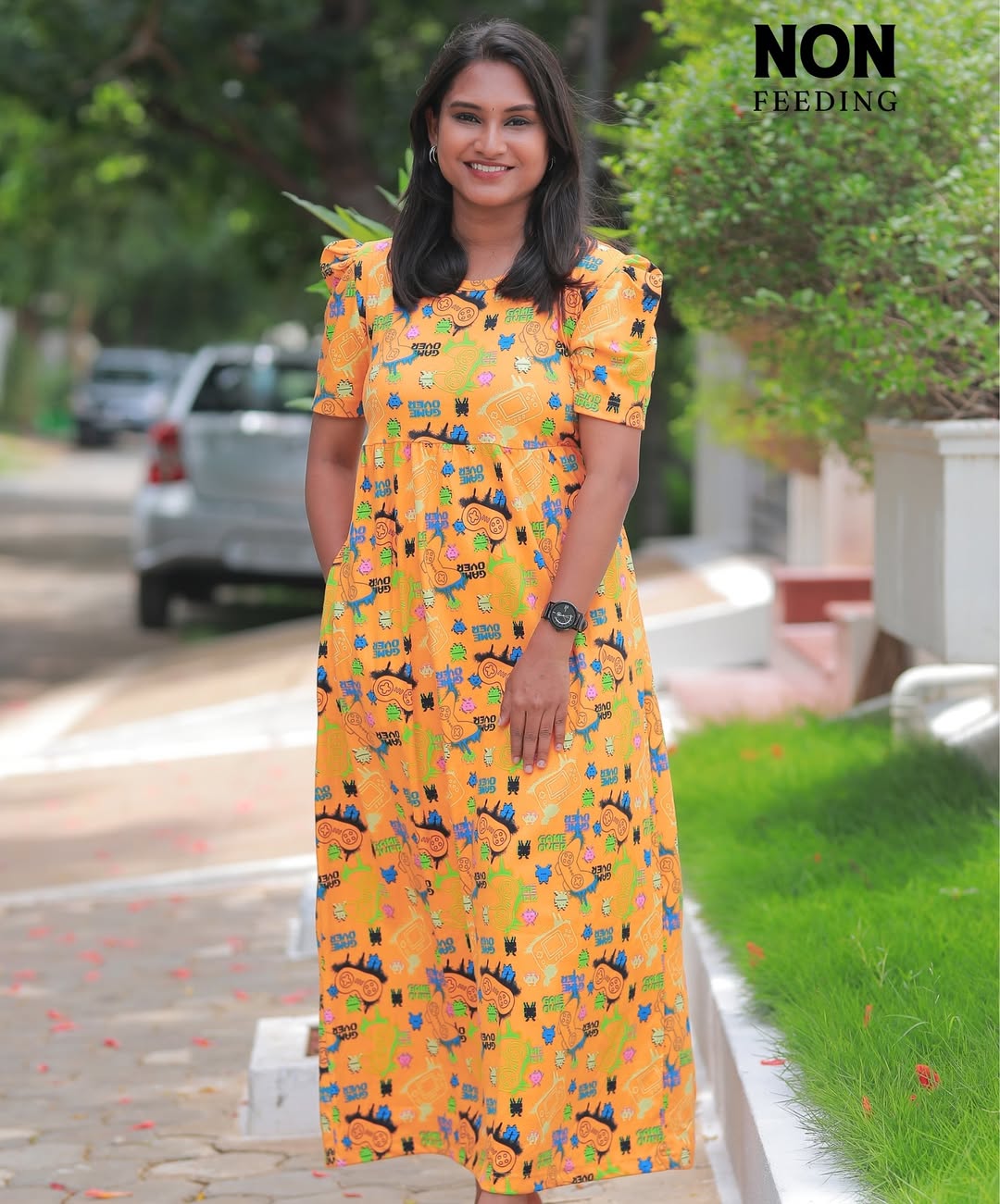 Vibrant orange paired with whimsical prints offers a cheerful interpretation of the classic maxi dress. Puff sleeves and a relaxed fit ensure comfort, while the bold pattern adds significant personality.