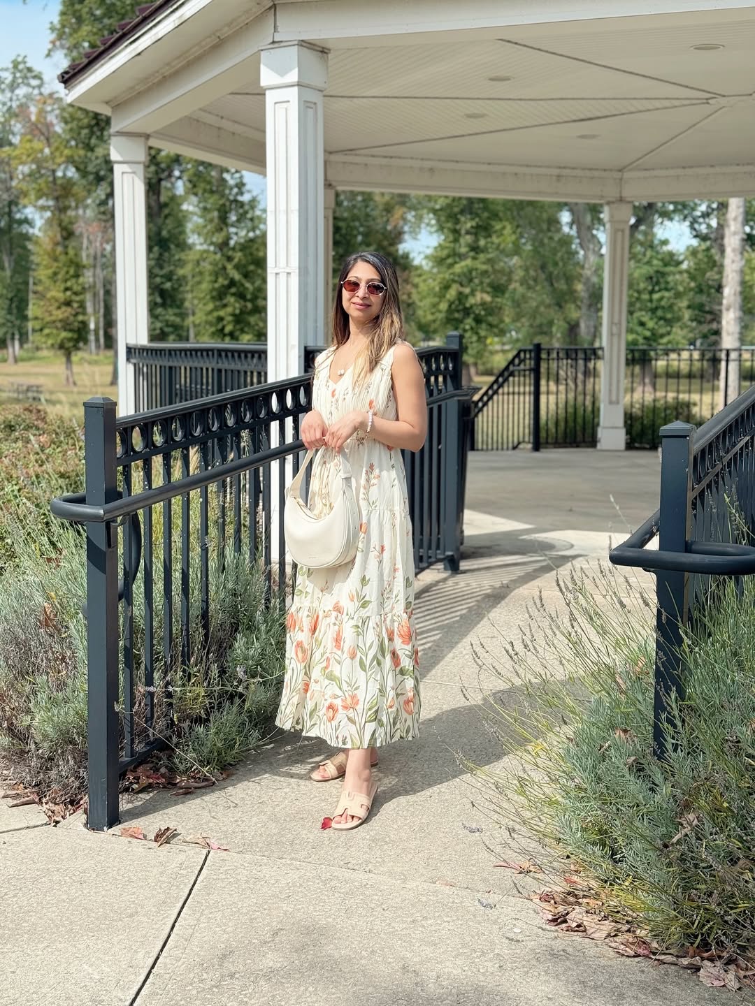 Paired with simple sandals and a structured shoulder bag, it offers a practical yet pretty aesthetic, embodying the ideal casual maxi dress.