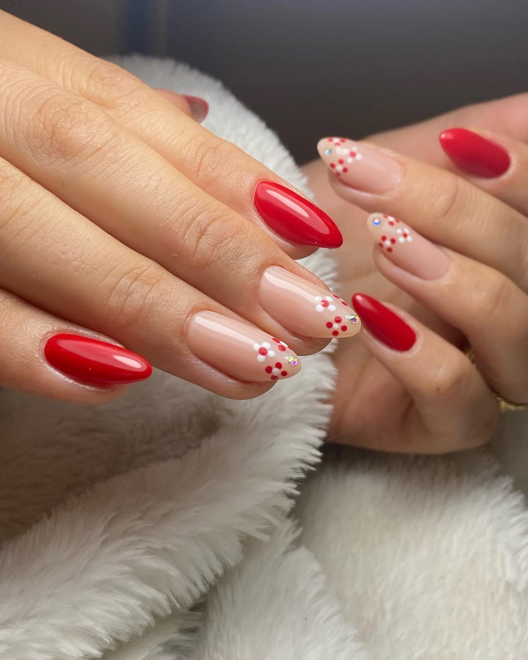 A bright, glossy red is interspersed with soft nude nails, each adorned with playful red-and-white dot florals and minuscule rhinestones. The overall look is charming, flirtatious, and possesses a retro appeal.