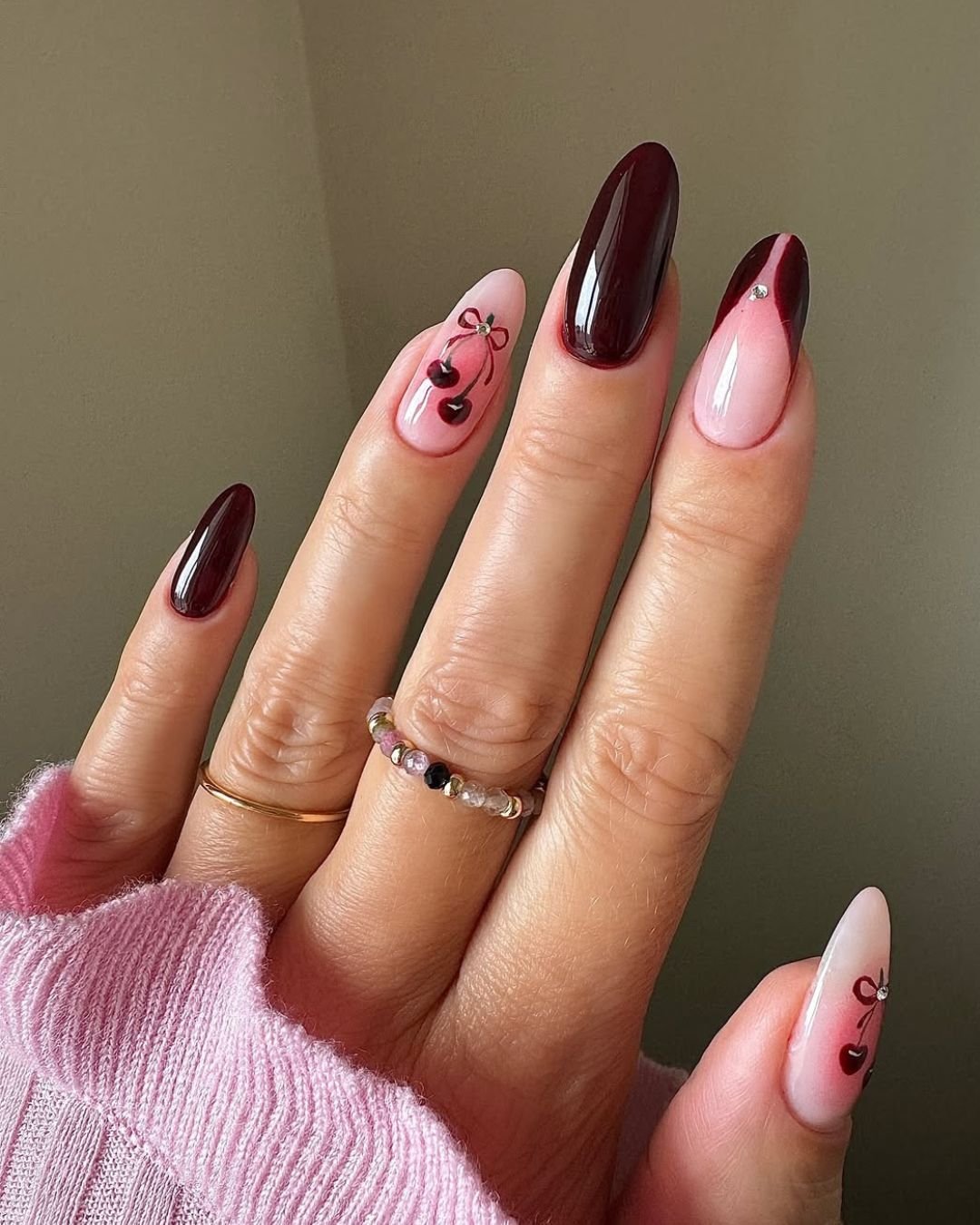 This design features a captivating mix of glossy deep wine tones and soft pink accent nails, embellished with tiny cherries and bow details. The result is a look that is sweet yet possesses a distinct edge.