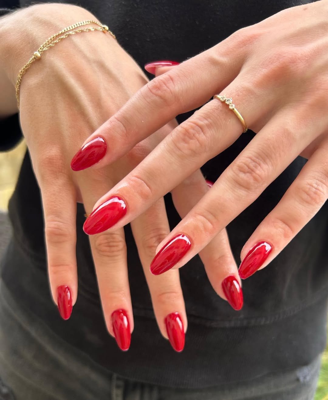 Glossy, medium-length almond nails are presented in the richest shade of red. This design eschews art and glitter, focusing purely on impeccable shine and flawless shaping.
