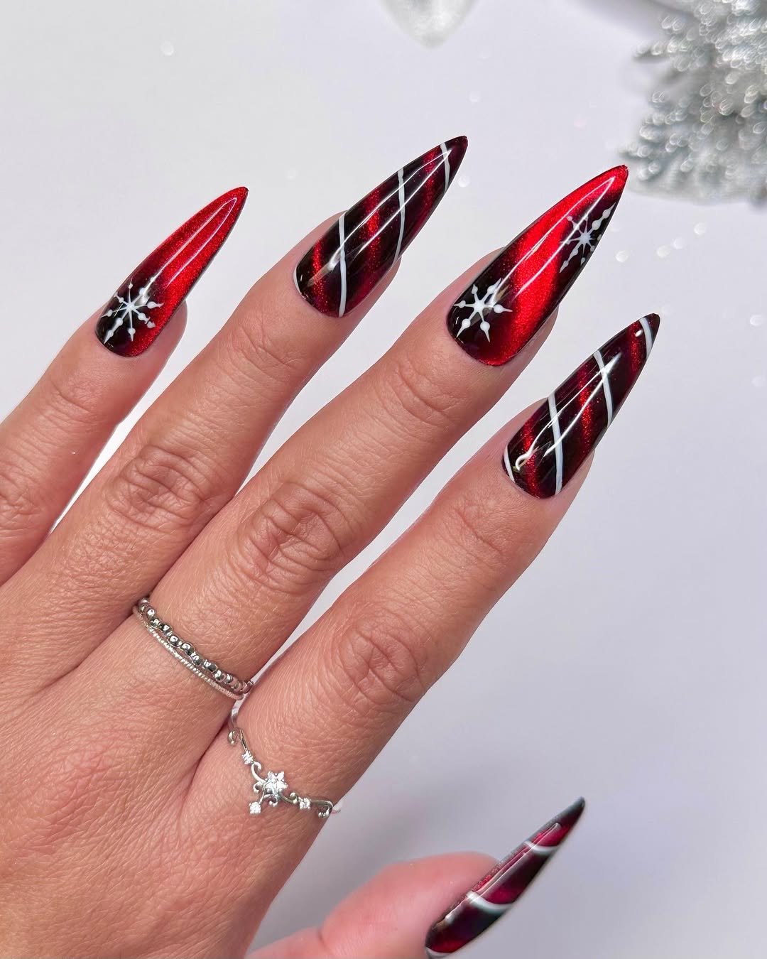 Long stiletto nails in a deep red chrome finish are adorned with icy white linework and understated snowflake accents, creating a look that is bold, sleek, and undeniably glamorous.