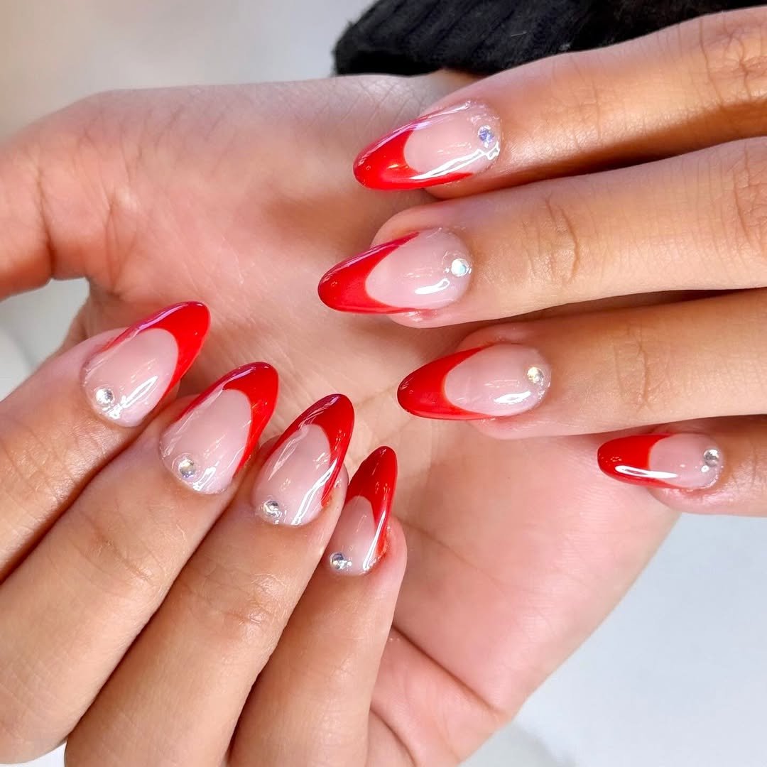 This rendition of the red French tip breaks conventional norms. The sharp, diagonal tips over a glossy nude base distinctly elongate the almond shape, while tiny rhinestones near the cuticle add a subtle sparkle that catches the light without dominating the design.