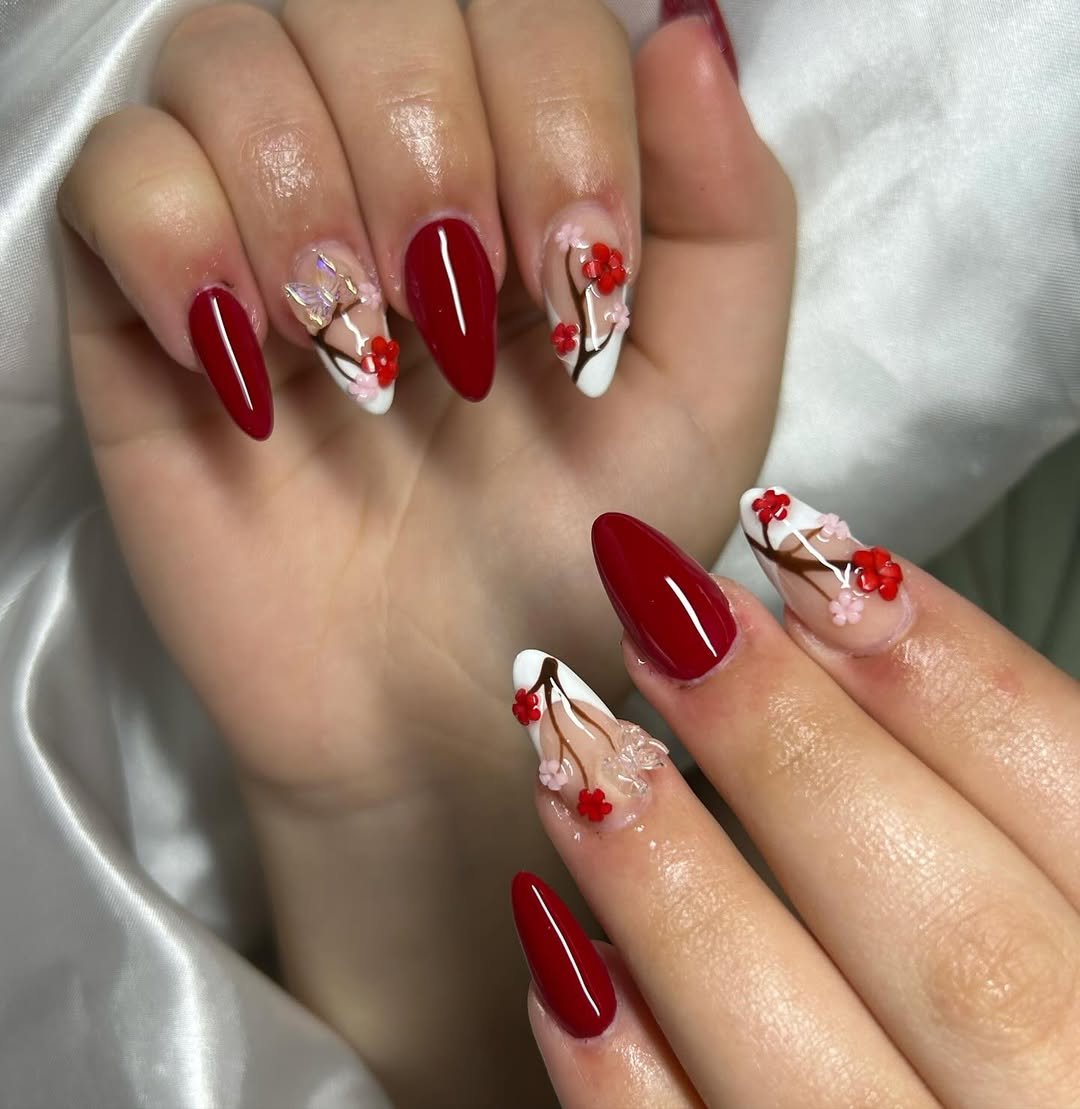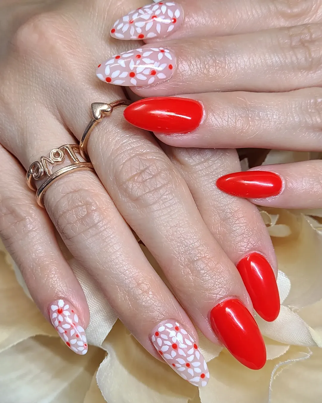 The solid red nails provide a grounding element, while the floral accents maintain a light and airy feel. This design perfectly balances boldness with softness.