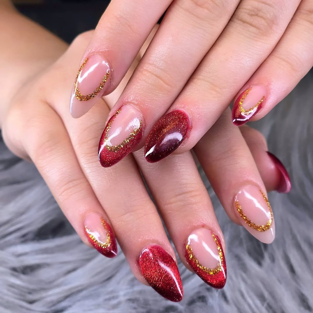 A deep red shimmer merges with negative space, outlined by rich gold glitter curves. The effect is dramatic yet polished, akin to a velvet gown accessorized with gold jewelry.