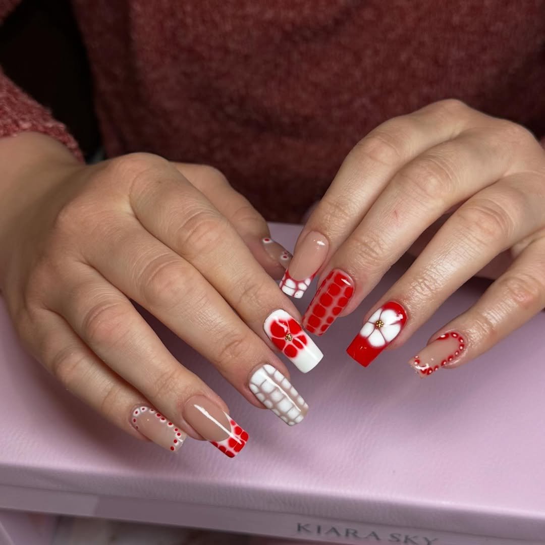 Bright cherry red is paired with soft nude nails adorned with tiny white petals and subtle red dots. The overall aesthetic is delicate, fresh, and surprisingly adaptable.