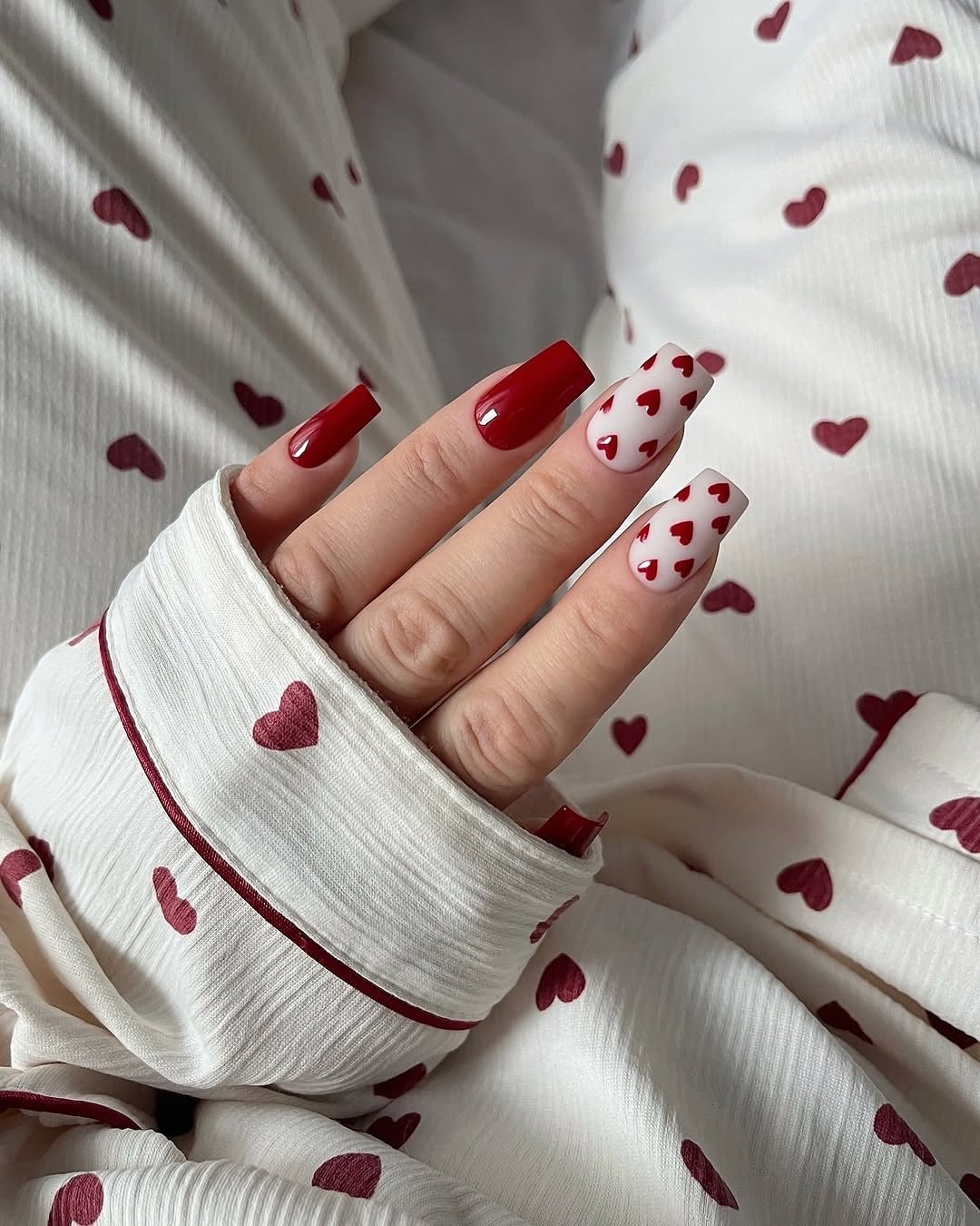 Solid red square nails are paired with creamy white nails meticulously covered in tiny red hearts. This design is playful, flirtatious, and subtly reminiscent of Valentine’s Day, yet perfectly wearable year-round.