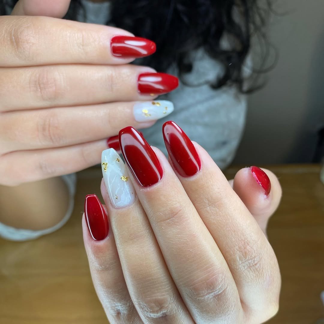 It projects an aura of mature elegance, embodying a polished and elevated approach to red nails. This is an excellent choice for those who appreciate red but desire a refined accent to break up the solid color.