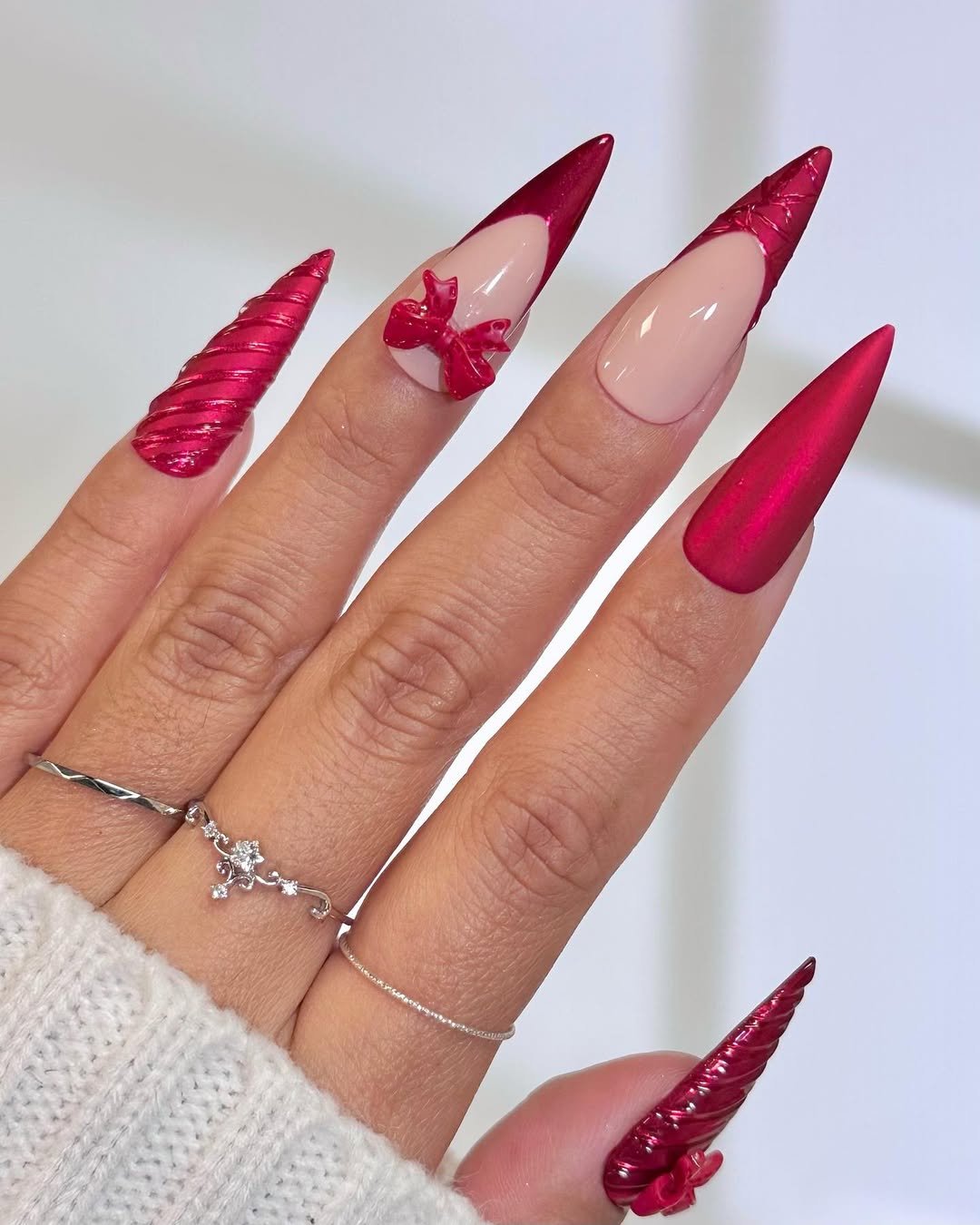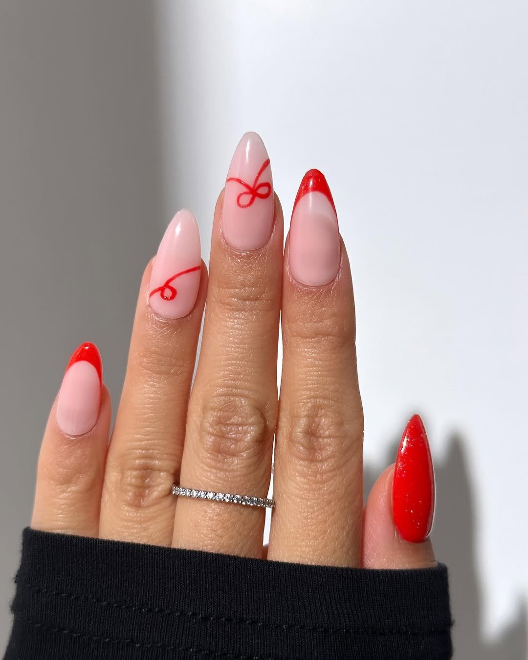 Glossy solid red nails are paired with soft nude accent nails, intricately detailed with delicate bow art in red and white. The aesthetic is clean, graphic, and evokes a charming “gift-wrapped” energy in the most stylish manner.