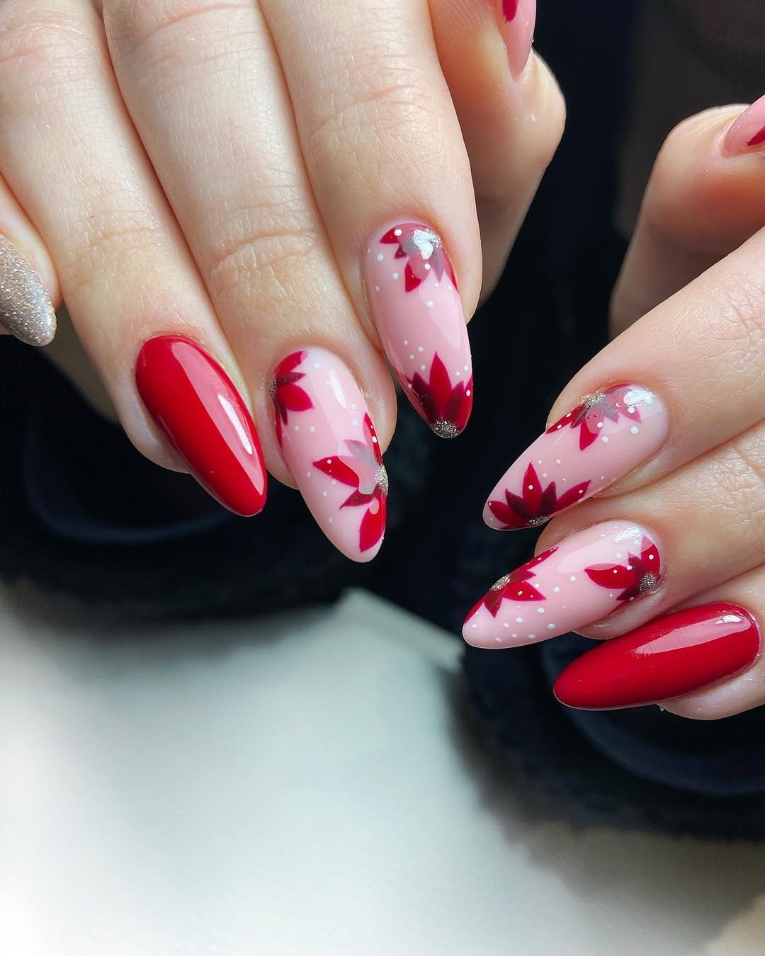 This nail set radiates romantic allure with a softly focused aesthetic. Glossy crimson nails are complemented by a milky pink base, adorned with striking red floral petals and delicate white speckles, reminiscent of snow falling on poinsettias.