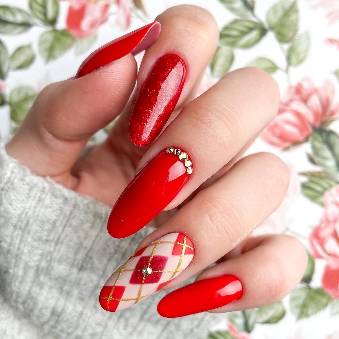 Glossy red nails are paired with a plaid-inspired accent nail, meticulously outlined with gold striping and finished with subtle crystal embellishments. The result is a design that feels rich, refined, and subtly festive.