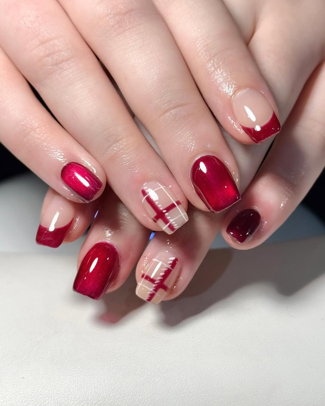 Short, rounded nails showcase glossy red alongside soft plaid accents and subtle shimmer tones. The overall effect is cozy yet remarkably polished.