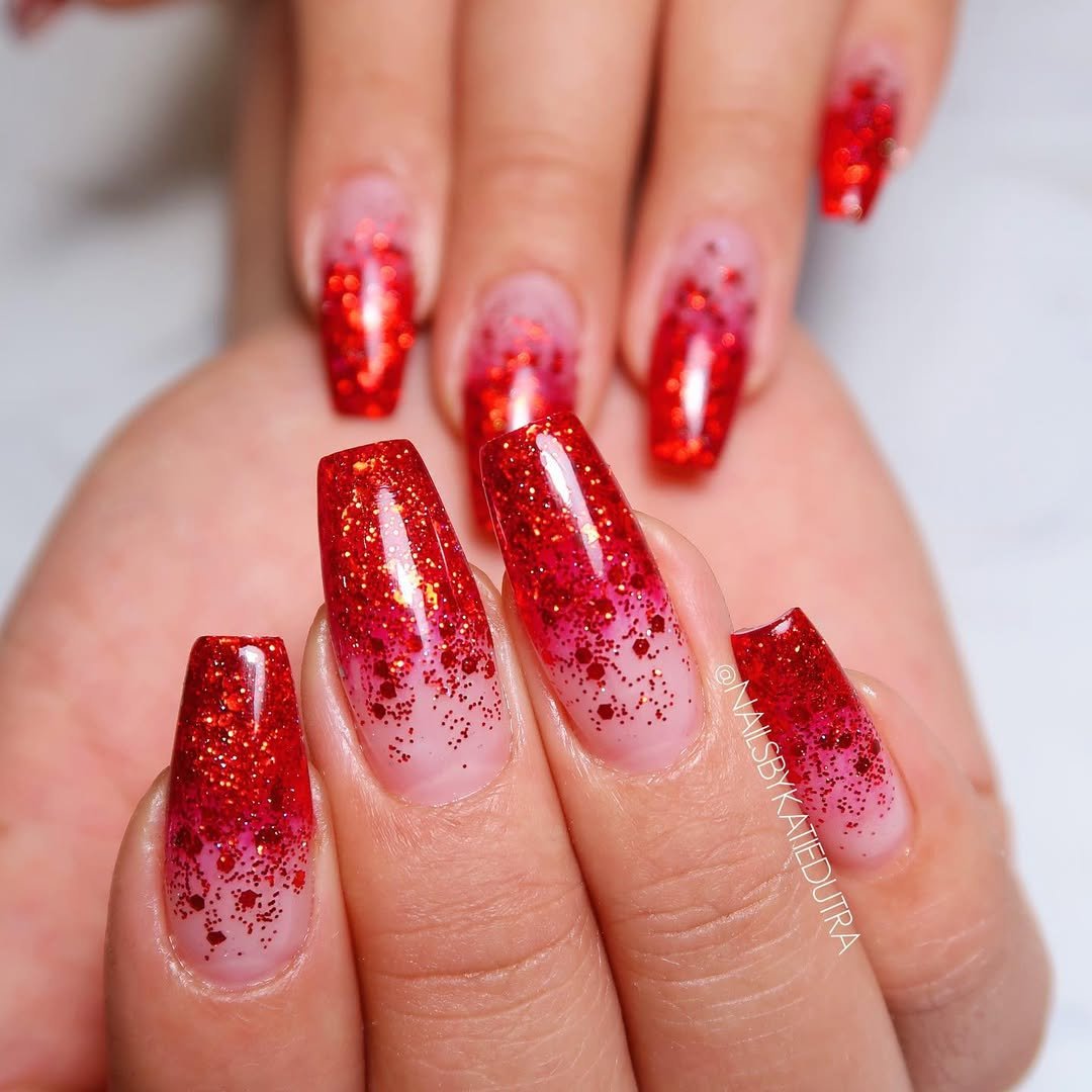 A soft nude base gracefully transitions into intense red glitter at the tips, creating an ombré effect that is pure sparkle and drama.