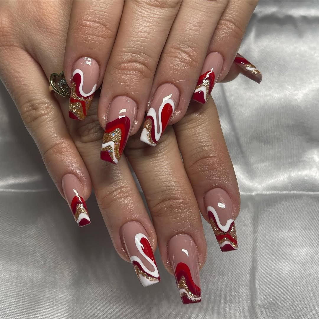 This nail set captures a sense of fluid motion. Intertwining red and white swirls are enhanced with rich gold glitter, creating a luxurious, almost molten effect.