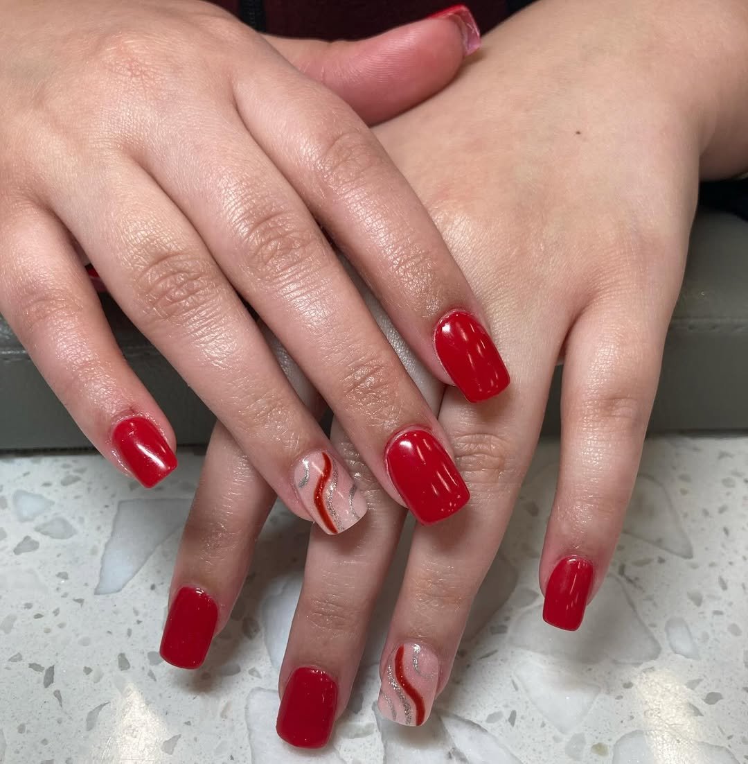 This design demonstrates that classic red can be enhanced with a single, elegant twist. Glossy, short square red nails receive a sophisticated upgrade with a nude accent nail featuring delicate red and white swirls.