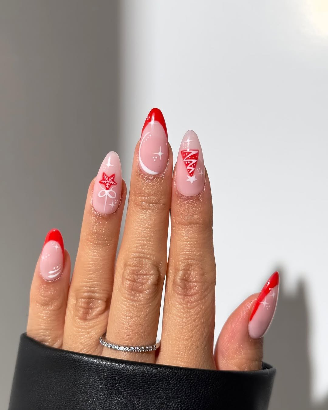 This design reimagines the classic French tip by utilizing bold red instead of white. The addition of tiny snowflake details and crisp white accents infuses a festive, yet supremely chic, holiday vibe.