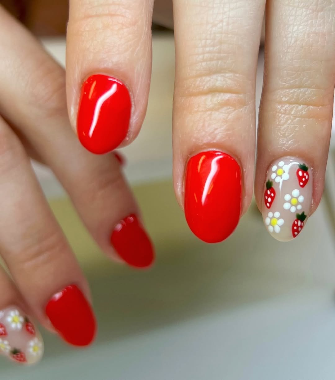 Bright, glossy red is featured on short, rounded nails, enhanced by an adorable strawberry-and-daisy accent design. This combination instantly lifts the mood.