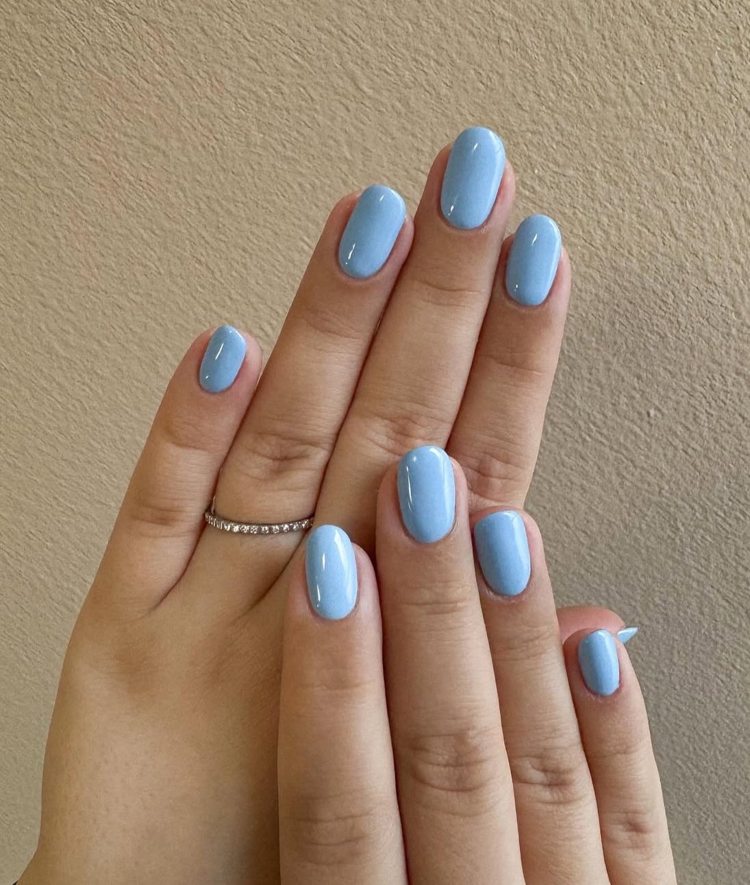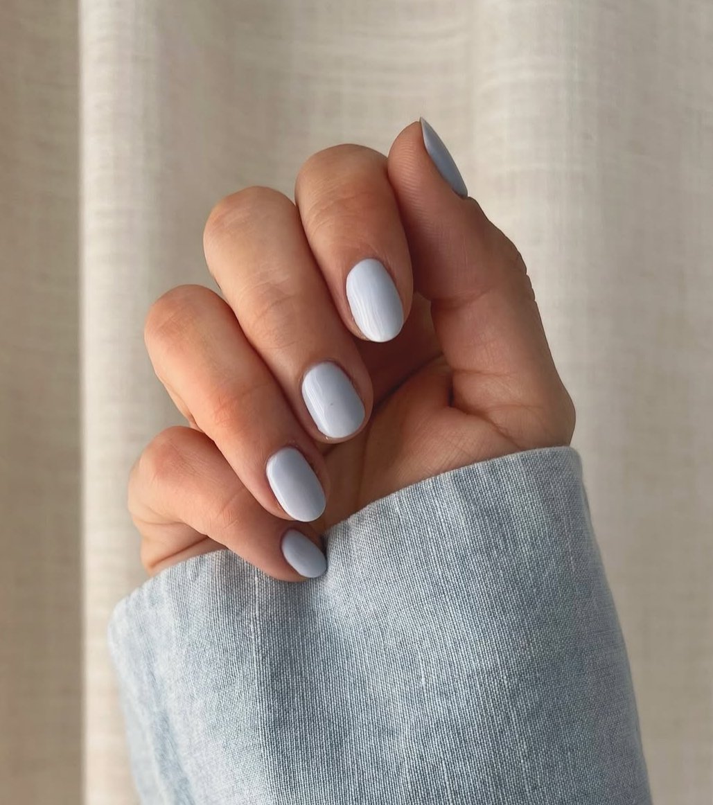 A creamy pastel blue on short, rounded nails embodies a sense of fresh beginnings and renewal. The cool, calming hue is reminiscent of clear skies following a spring rain.