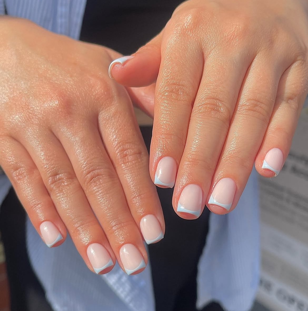 Crisp baby blue tips on short nude nails create a look that is exceptionally clean and fresh. The pastel blue shade distinctly signals spring in a sophisticated manner.
