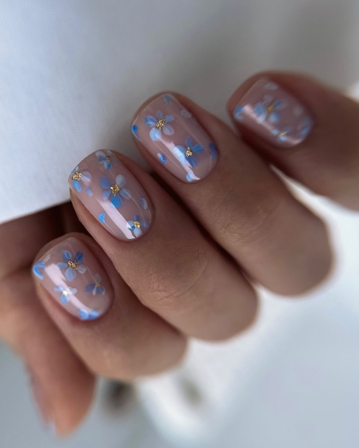 Delicate blue floral elements with subtle gold centers drift across a translucent nude canvas, evoking the gentle strokes of a watercolor painting. This design is light, airy, and ideally suited for natural short nails, exuding an effortless charm.