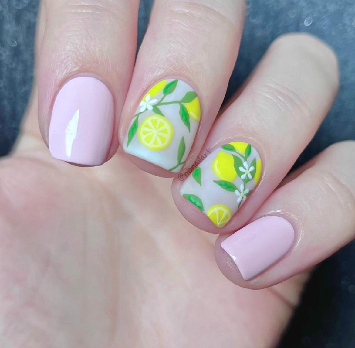 Soft blush nails are paired with a charming lemon and leaf accent design, bringing sunshine to your fingertips. The bright yellow pops beautifully against the muted base, creating a fresh and slightly unexpected combination.
