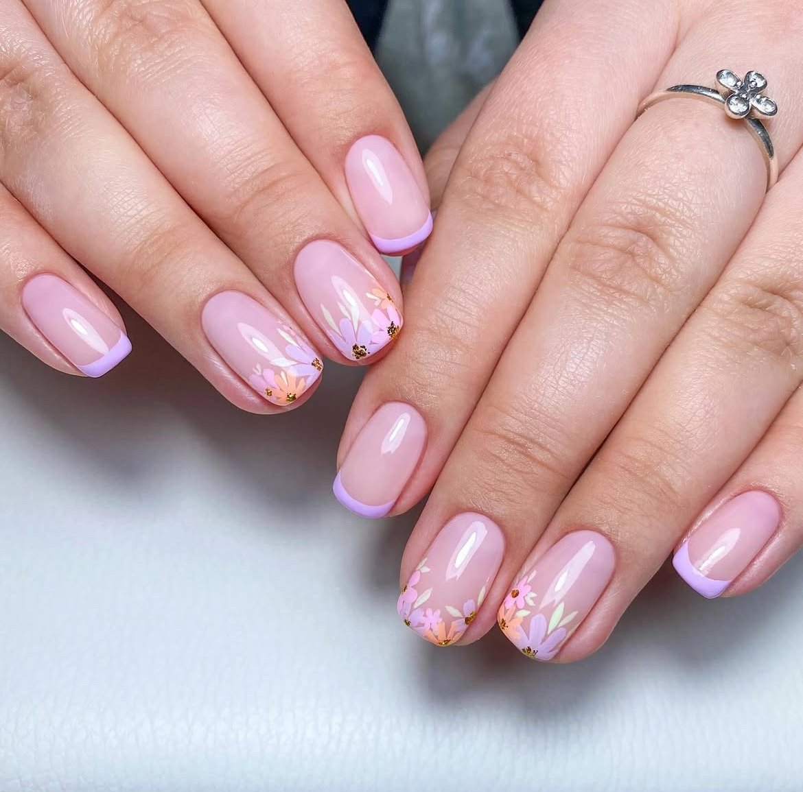 This design features soft pink nails with delicate lilac French tips and subtle floral accents, offering a touch of spring romance. The colored tips add a contemporary twist to the traditional French manicure style.