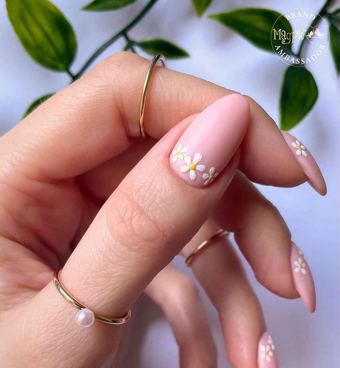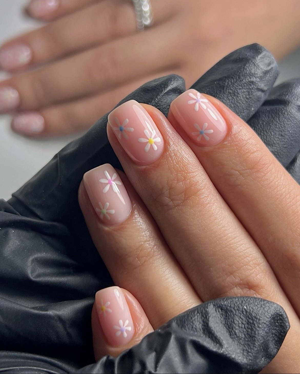 Tiny daisies scattered across a glossy blush base add an adorable touch. The short length ensures practicality, while the delicate white petals deliver instant spring charm.