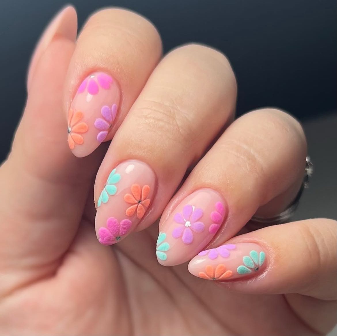 Matte nude nails are elevated with raised pastel flowers in shades of lilac, mint, coral, and pink. This design introduces interesting texture and playful colors that complement the short nail shape without being overwhelming.