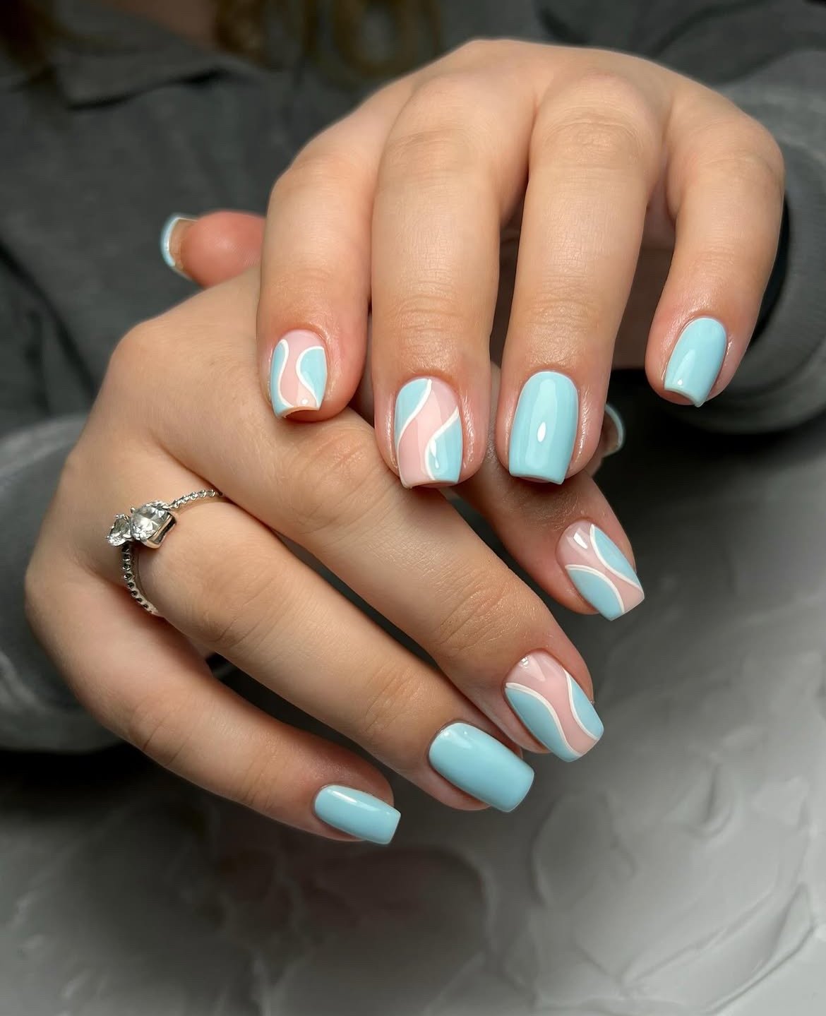 Baby blue combined with soft pink swirls creates a playful yet sophisticated design. The wavy accents add a dynamic feel, balanced by the solid pastel nails for a cohesive look.