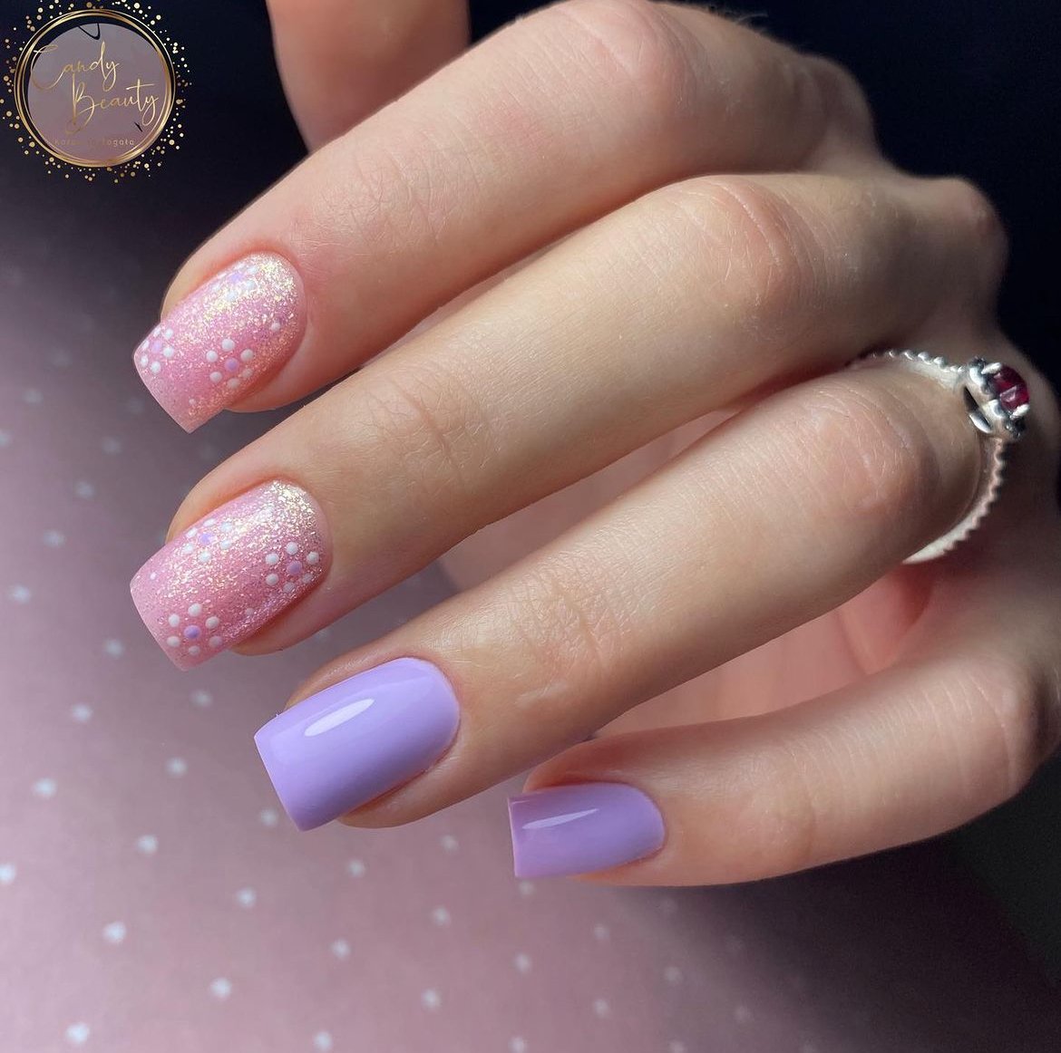 A combination of soft, glittery pink and creamy lilac on short square nails offers a delightful contrast and dimension. The subtle sparkle adds depth, while the pastel pairing keeps the look feeling fresh and vibrant.