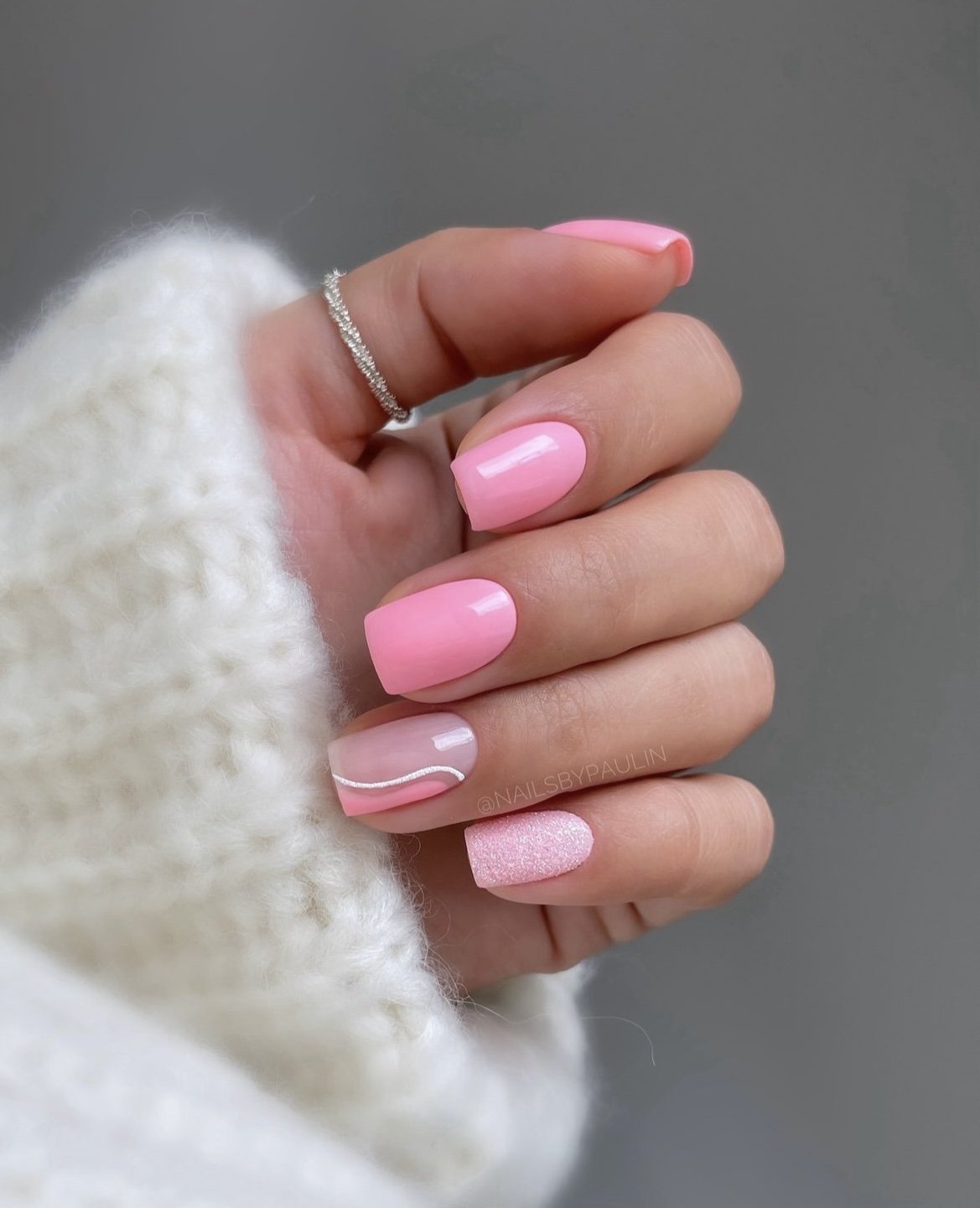 Featuring various shades of pink, a glitter accent, and a subtle wave detail, this set is playful without being excessive. The short square shape keeps the design grounded and practical.