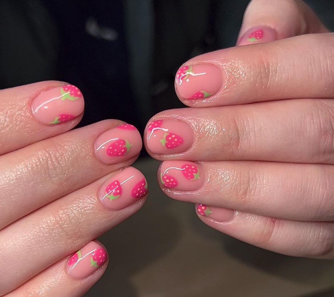 Picture tiny, vibrant strawberries artfully placed over a glossy, sheer nude background. This design embodies spring in the most charming way, with the bright fruit offering a playful contrast against the subtle base, preventing the look from becoming too busy.