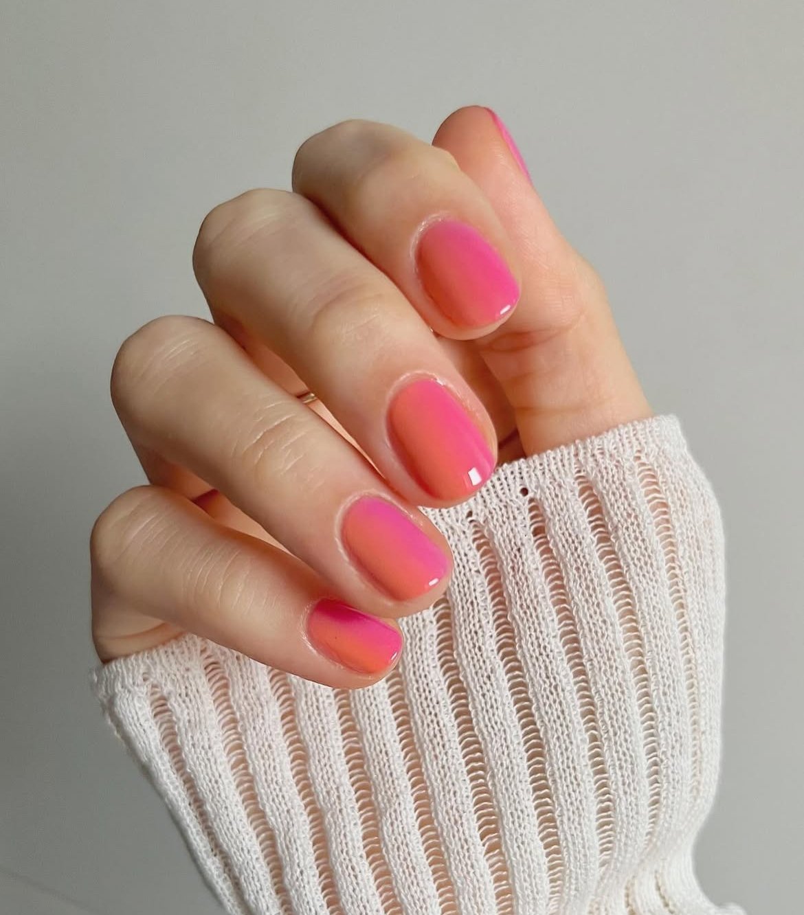 This seamless pink-to-orange ombré gradient on short nails captures the essence of a summer sunset. The blend is so smooth it appears airbrushed, transitioning from juicy coral to hot pink with a gentle gradient.