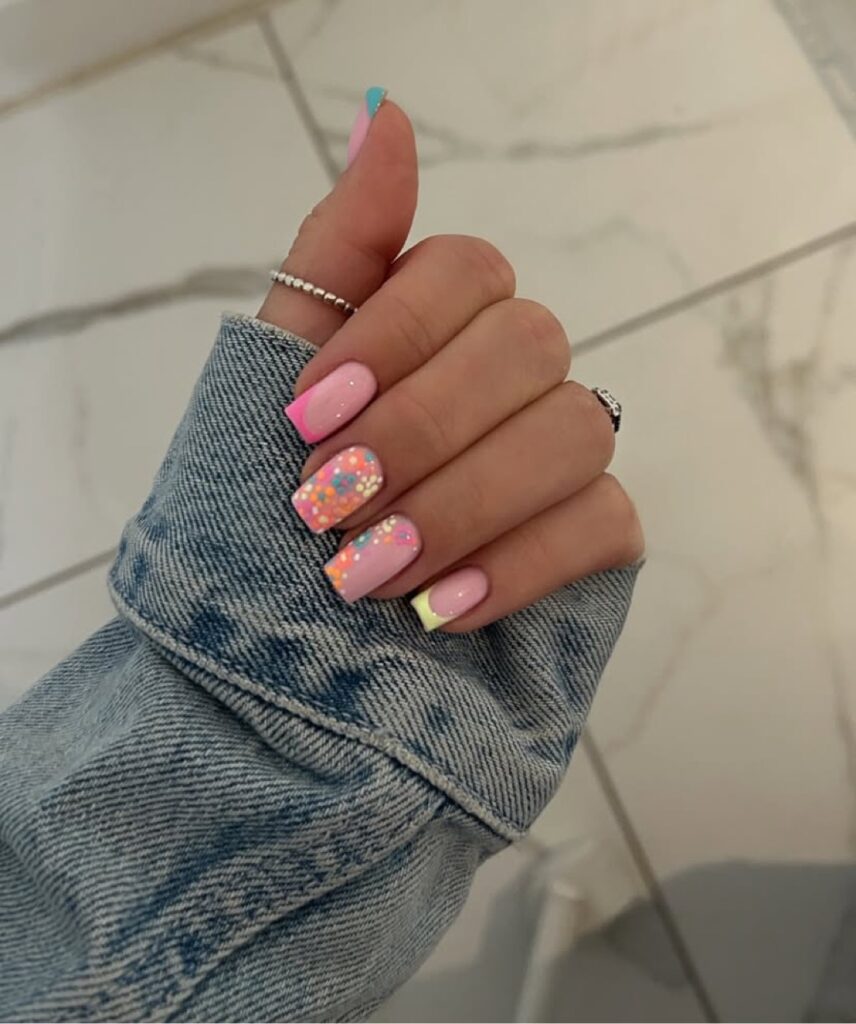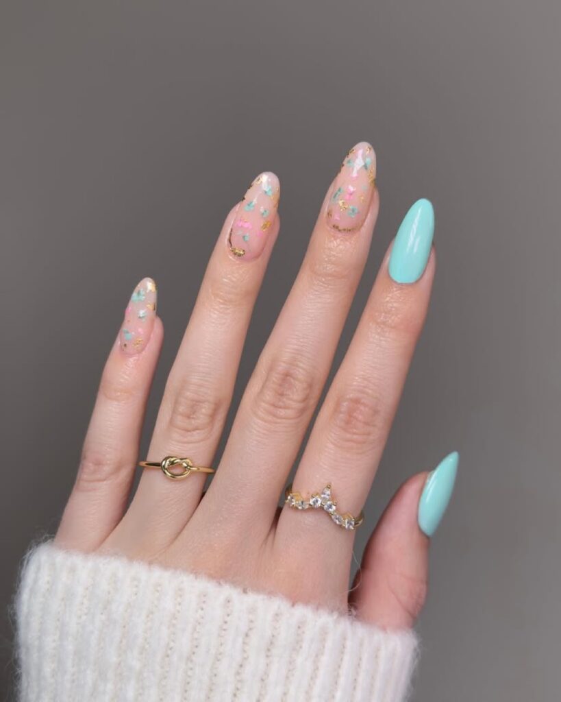 This combination of gentle pastel shades evokes a sense of cheerfulness and ease. The colors harmonize beautifully without any jarring contrasts, creating a fluid and relaxed spring aesthetic. These nails have the power to instantly uplift one’s mood, offering simple colors and happy vibes without any added stress, embodying a perfectly laid-back spring feel.