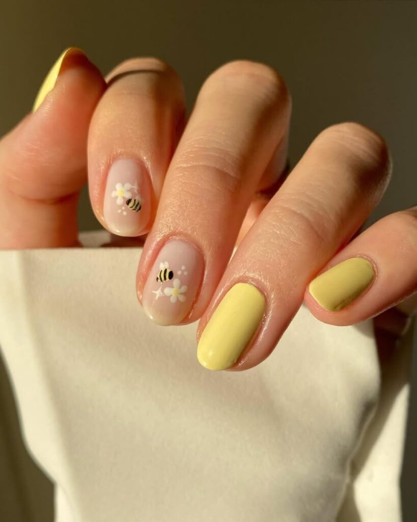 This set embodies the serene side of spring. Milky bases are enhanced by soft yellow accents and tiny bee details, creating a look that is more sweet than striking. It achieves a minimalist yet engaging aesthetic, akin to a quiet moment in a garden. The high wearability of this design allows it to transition seamlessly from brunch to the workplace, demonstrating the significant impact of small, thoughtful details.