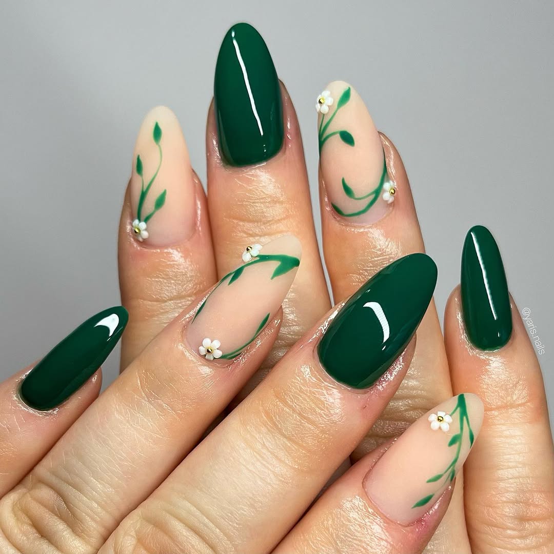 This deep green hue, complemented by delicate vine-like details, offers an earthy and natural aesthetic. It feels fresh, grounded, and intriguingly unique, evoking the feeling of stepping into a tranquil garden after a gentle rain. This set skillfully blends solid, bold colors with soft botanical art, proving that spring nails can embrace nature’s deeper tones while still feeling perfectly seasonal.